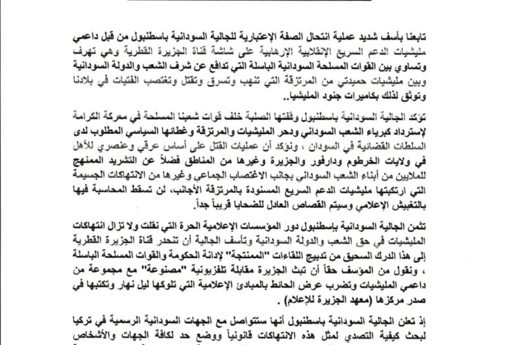 تثمن الجالية السودانية بإسطنبول دور المؤسسات الإعلامية الحرة التي نقلت ولا تزال انتهاكات المليشيات في حق الشعب والدولة السودانية وتأسف الجالية أن تنحدر قناة الجزيرة القطرية إلى هذا الدرك السحيق من تدبيج اللقاءات “الممنتجة” لإدانة الحكومة والقوات المسلحة الباسلة ، ونقول من المؤسف حقاً أن تبث الجزيرة مقابلة تلفزيونية “مصنوعة” مع مجموعة من داعمي المليشيات وتضرب عرض الحائط بالمبادئ الإعلامية التي تلوكها ليل نهار وتكتبها في صدر مركزها (معهد الجزيرة للإعلام) .